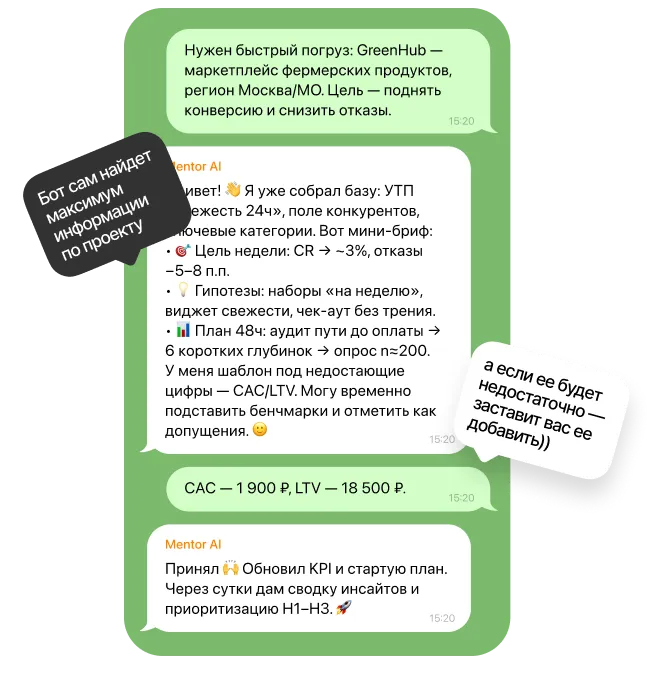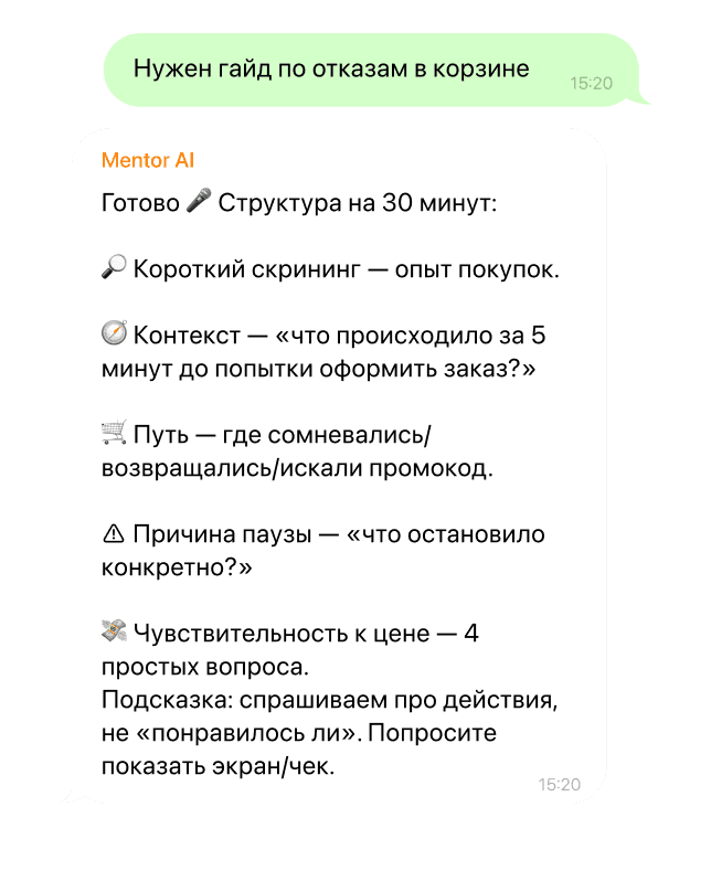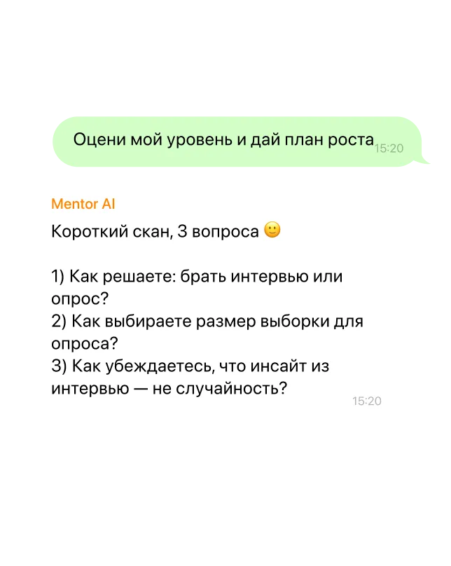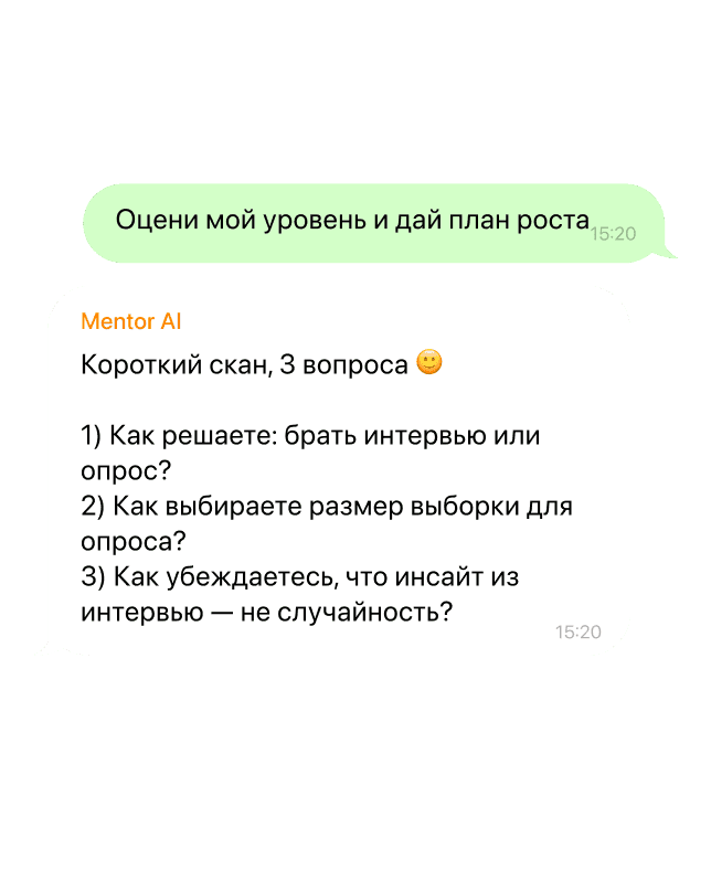У тебя будет собственный ассистент на базе ИИ, который знает все о продуктовых исследованиях. Застрял с формулировкой гипотезы? Не знаешь, какой фреймворк выбрать? Просто спроси его в Telegram и получи ответ за 30 секунд. Это как иметь ментора-эксперта в кармане