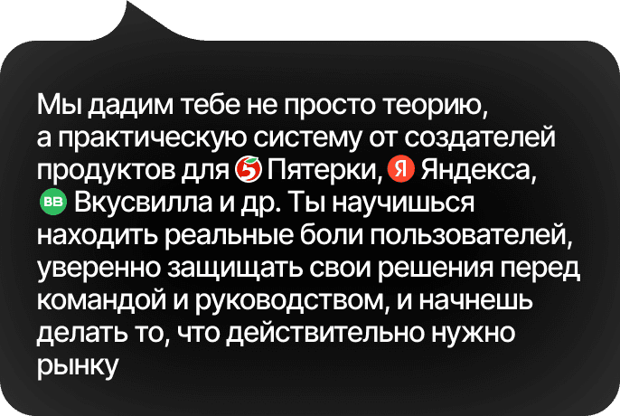 Мы дадим тебе не просто теорию, а практическую систему от создателей продуктов для Пятерки, Яндекса, Вкусвилла и др. Ты научишься находить реальные боли пользователей, уверенно защищать свои решения перед командой и руководством, и начнешь делать то, что действительно нужно рынку